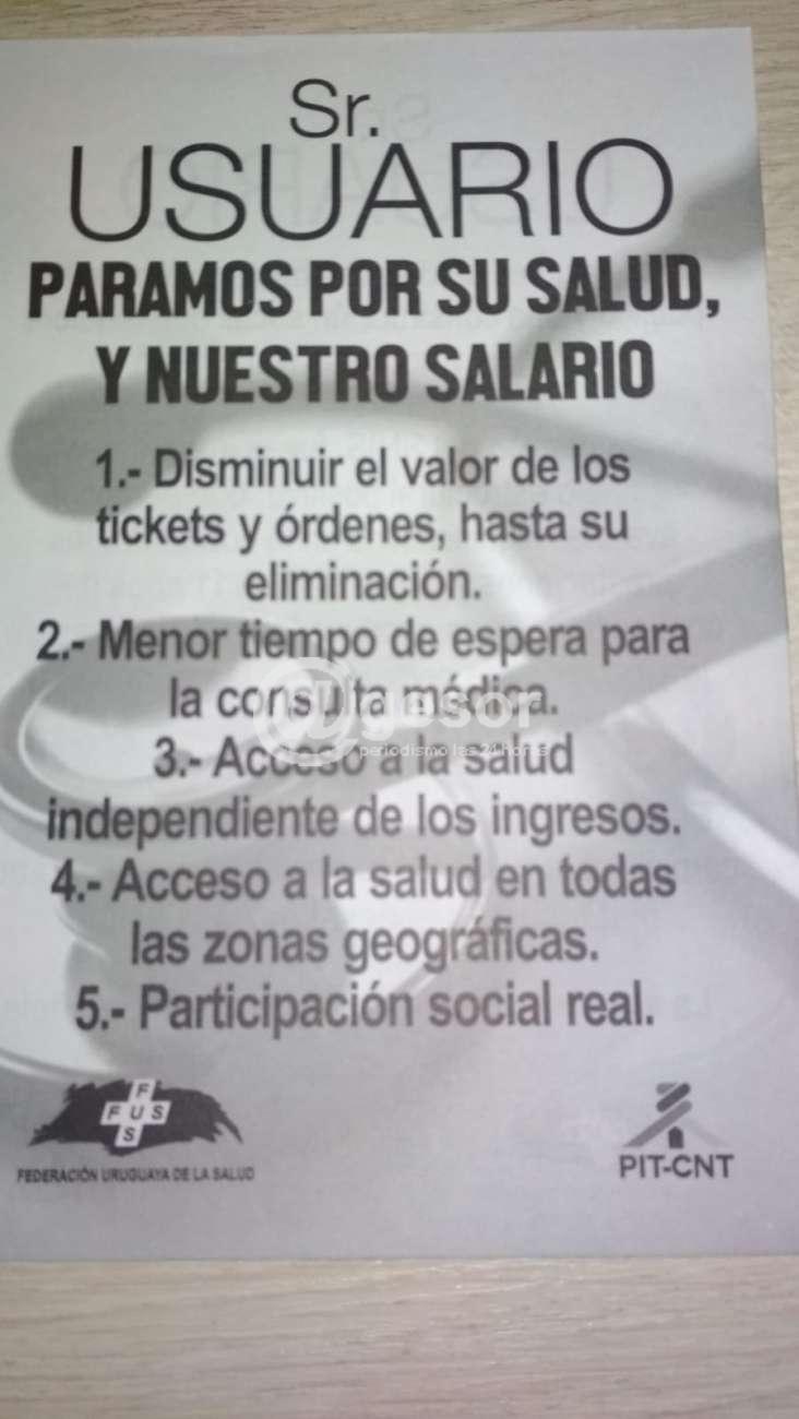 Funcionarios de Cams se movilizaron esta mañana en la puerta del Policlínico de Mercedes. La medida se enmarca en la serie de movilizaciones que viene realizando la Federación Uruguaya de la Salud (FUS) de cara al paro nacional que se realizará el 22 de agosto próximo.