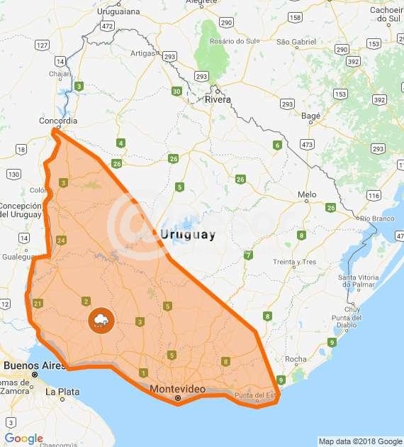 El Instituto Uruguayo de Meteorología emitió una alerta de color naranja por tormentas  fuertes para 13 departamentos,  que abarcan el área Metropolitana, Centro-Sur y Suroeste del país.