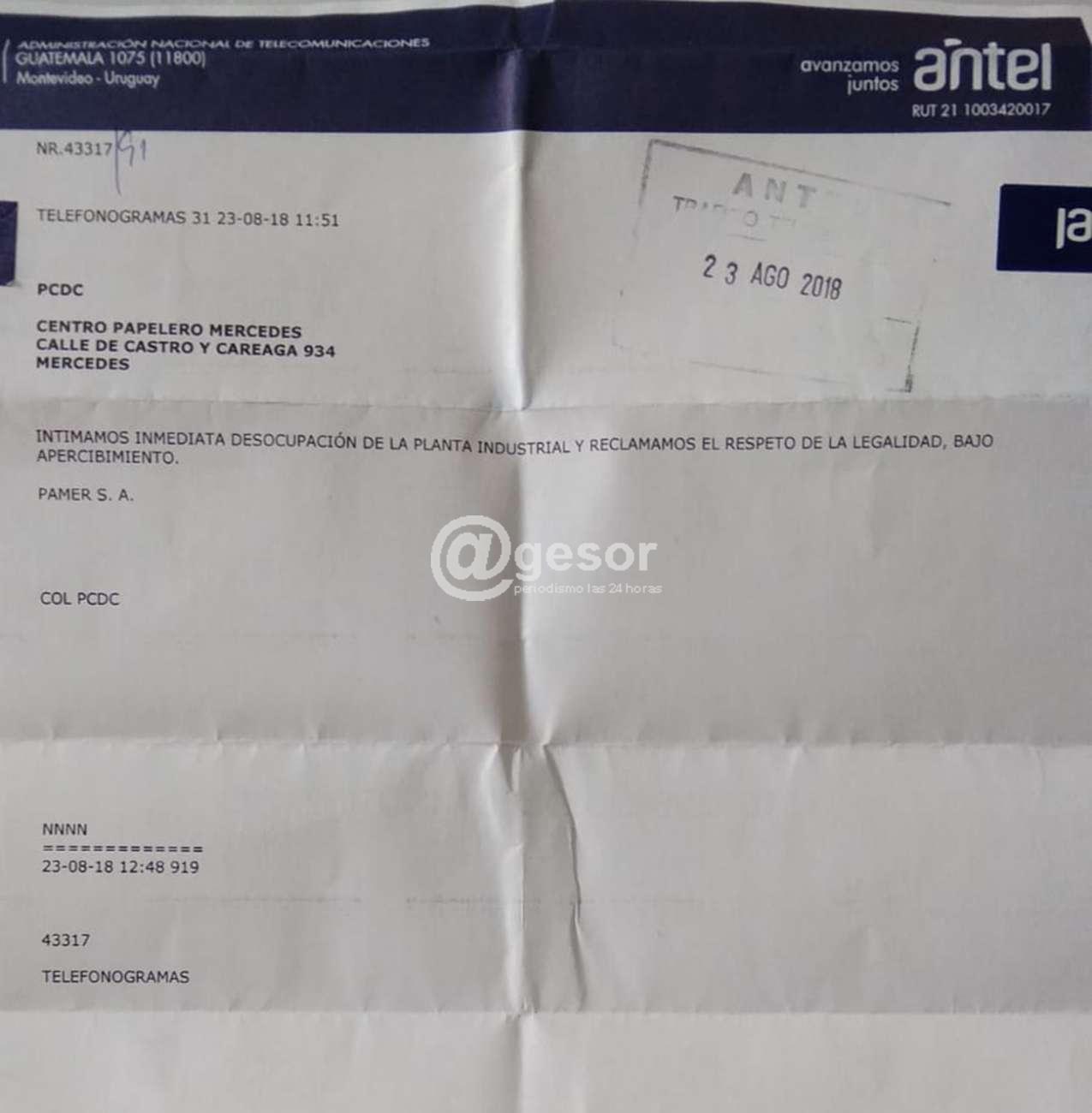 Si bien los trabajadores anunciaron que continuarán con la medida de ocupar la fábrica, Pamer les envió un telegrama expresando: "Intimamos inmediata desocupación de la Planta industrial y reclamamos el respeto de la legalidad, bajo apercibimiento".