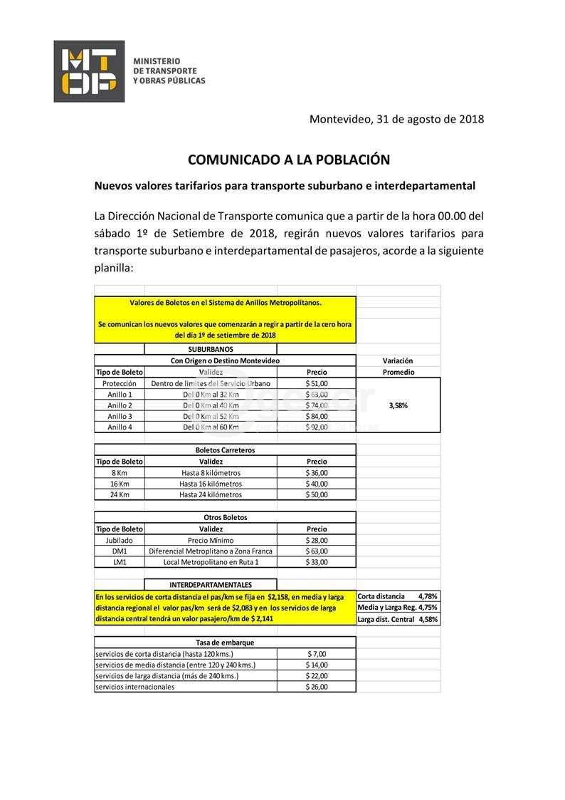 La Dirección Nacional de Transporte informó que a partir de la madrugada de este 1° de setiembre aumenta el precio de los boletos de ómnibus suburbanos e interdepartamentales. En promedio, los primeros aumentan un 3,58% y los segundos un 4,7 %.