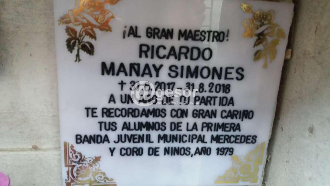 En la mañana de este domingo, tal como estaba previsto, se descubrió una placa junto a su tumba , donde un grupo de ex alumnos y ex integrantes de la Banda Juvenil Municipal recordaron al prof. Ricardo Mañay. Una figura de la cultura mercedaria impulsor de varias iniciativas artísticas y quien estuvo al frente del Conservatorio Municipal, institución por donde pasaron numerosos músicos del medio.