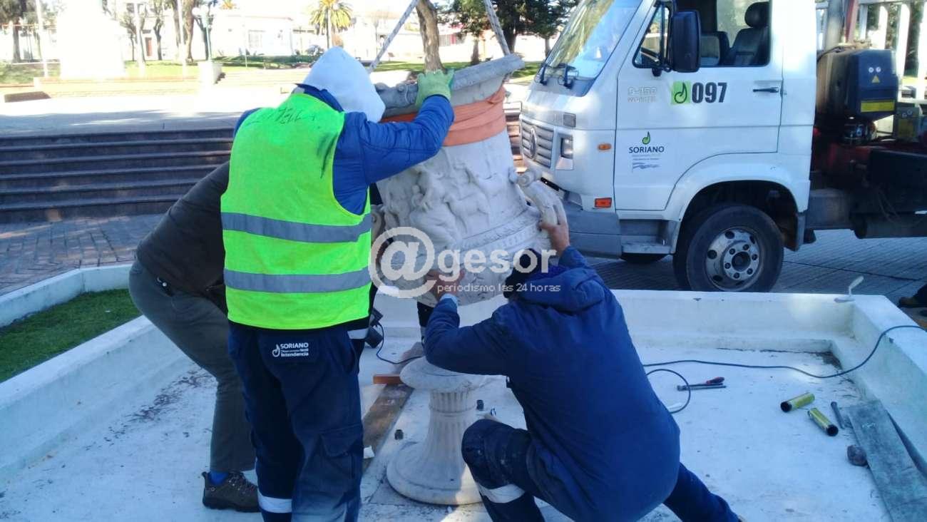 Como oportunamente informáramos uno d e los añejos copones que decoran la Plaza Rivera de Mercedes fue tirado al piso, sufriendo algunas roturas. Un hecho lamentable que se suma al desprecio que algunos individuos tienen por los bienes materiales y afectivos de la ciudad. Este copón con delicadísimos bajorrelieves fue tirado al piso en horas de la noche anterior. En esta jornada personal municipal realizó trabajos para colocarlo en su lugar y comenzar con su reparación.