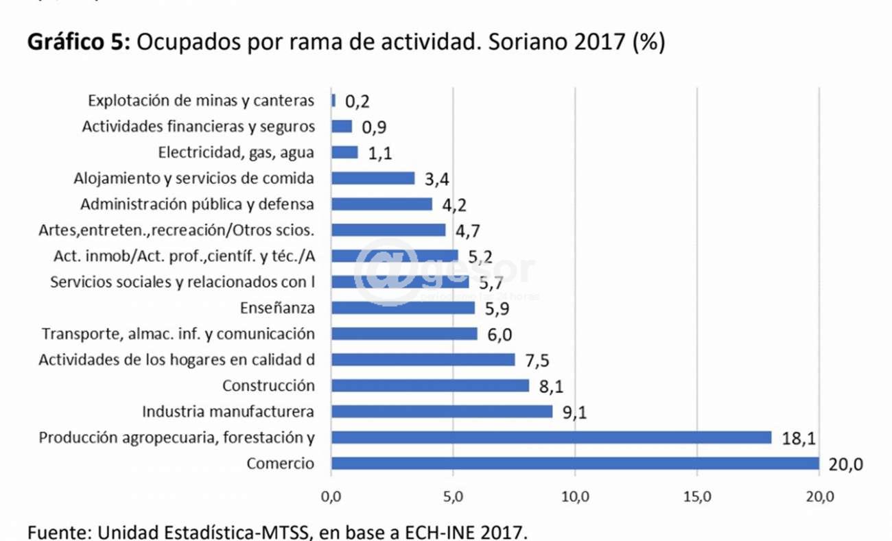 Respecto de los ocupados por rama de actividad para Soriano en el año 2017 se observa que las ramas con mayor ocupación son las primarias: comercio con un total de 7.920 personas (20,0%), seguida por producción agropecuaria, forestación y pesca con un total de 7.152 ocupados (18,1%) y luego con la mitad de presencia la industria manufacturera con 3.600 personas (9,1%).