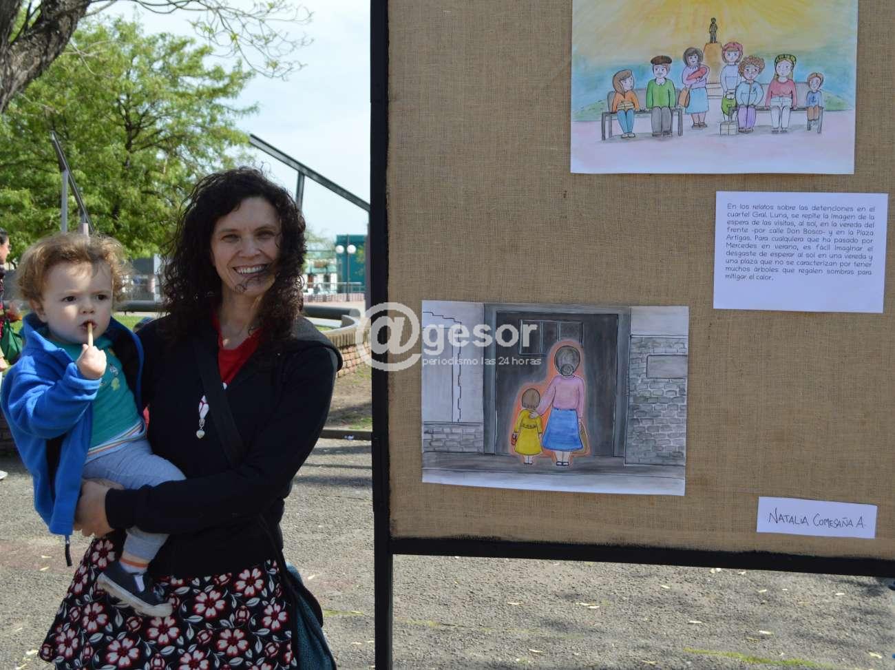 Uno de los telares muestra dibujos en los la leyenda de su autora expresa: "En los relatos sobre las detenciones en el cuartel "Gral. Luna", se repite la imagen de las visitas, al sol, en la vereda del frente - por calle Don Bosco- y en la plaza Artigas. Para cualquiera que ha pasado por Mercedes en verano, es fácil imaginar el desgaste de esperar al sol en una vereda y una plaza que no se caracterizan por tener muchos árboles que regalen sombras para mitigar el calor".