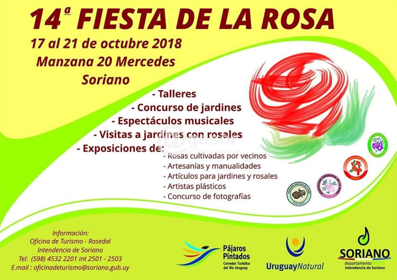 Hasta el domingo 21 de octubre se estará desarrollando la 14° Fiesta de la Rosa. Esta actividad impulsada por la Dirección de Turismo de la Intendencia de Soriano cada año congrega a un número importante de expositores, desarrollándose conferencias sobre el cultivo y cuidados de las rosas, y espectáculos musicales. Como ya es tradicional la actividad se centra en Manzana 20 desde las 17 horas en adelante.