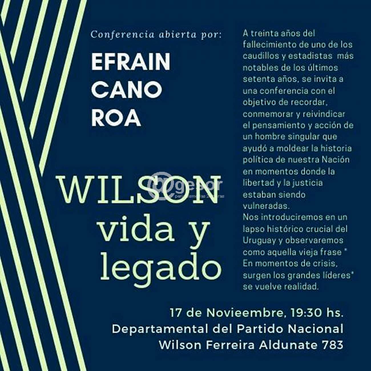 Este sábado 17 a las 19.30 horas en sede de la Departamental del Partido Nacional, en Wilson Ferreira Aldunate 783 de Mercedes, e realizará conferencia a cargo del Prof. Efraín Cano Roa titulada "WILSON, vida y legado".