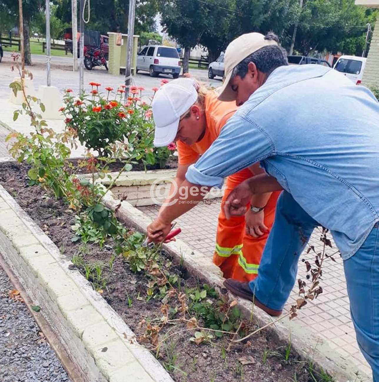La tarea es realizada por funcionarios municipales, algunos integrantes del grupo de jardinería y vecinos, con el asesoramiento del idóneo en rosales Esteban Erricalde.