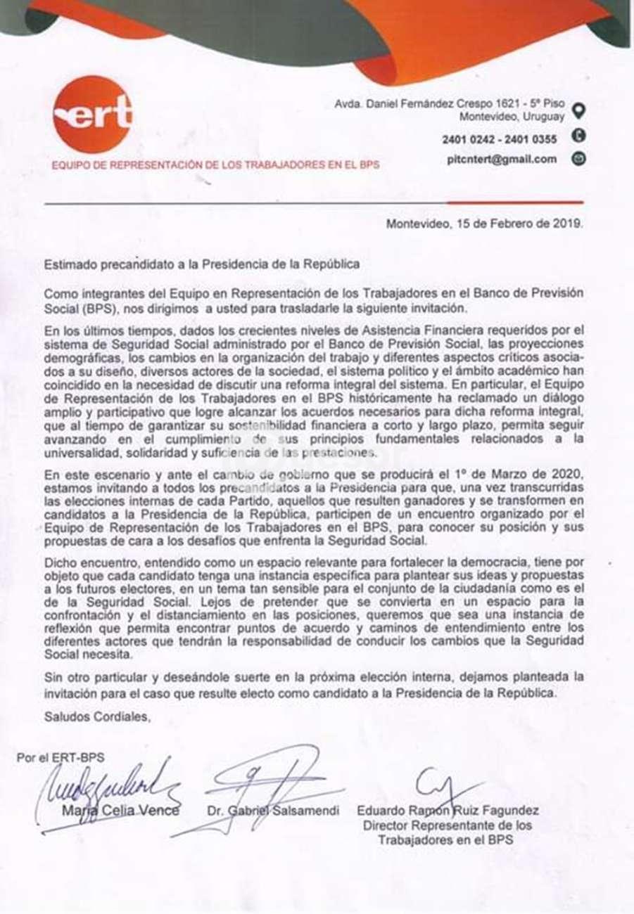 El Equipo de Representación de los Trabajadores (ERT) en el directorio del Banco de Previsión Social (BPS) invitó a los precandidatos de los partidos políticos a que una vez transcurridas las elecciones internas, aquellos que resulten ganadores, participen de un encuentro en el que puedan informar sobre sus planes y propuestas para los desafíos que enfrenta la Seguridad Social. La invitación se realiza ahora, porque desde el ERT se entiende que todos los dirigentes seguirán ocupando un lugar destacado en los equipos de cada partido político, independientemente quién sea el candidato o candidata triunfante en las elecciones internas.