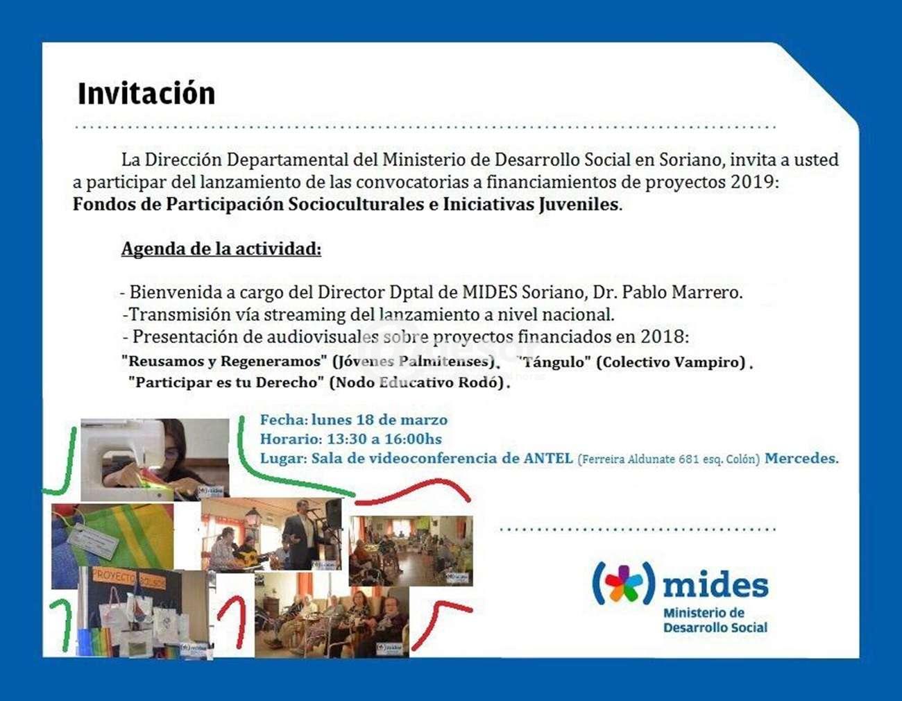 Este lunes a las 14 horas se realizará la presentación de las propuestas Socioeducativos y de Fondo de Iniciativas Juveniles. A nivel cultural en el año 2018 Mides apoyó ocho proyectos que fueron ejecutados a nivel de todo el departamento, es por ello que el día lunes estarán presente en el lanzamiento integrantes de algunos de los proyectos ganadores a los efectos de contar la experiencia de la participación, ellos son, Reusamos y Regeneramos ejecutado por el colectivo Jovenes Palmitenses, el proyecto Tángulo desarrollado por el colectivo Vampiro de Dolores y Participa es tu Derecho del Nodo Educativo Rodó.