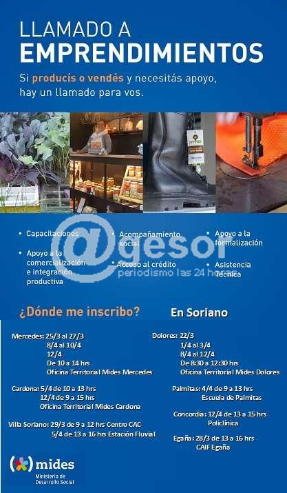 El Ministerio de Desarrollo Social a través de la División de Emprendimientos Productivos y Redes, de la Dirección Nacional de Economía Social e Integración Laboral informan del comienzo de las inscripciones en Soriano desde el próximo lunes 25 y hasta el viernes 12 de abril para todas aquellas personas que desarrollenEmprendimientos Productivos en pos de busca fortalecer la gestión, formalización, producción, comercialización y el acceso a recursos (financieros, materiales ytecnológicos) de los emprendimientos, así como las capacidades de sus integrantes, para mejorar la generación autónoma y sustentable de sus ingresos.