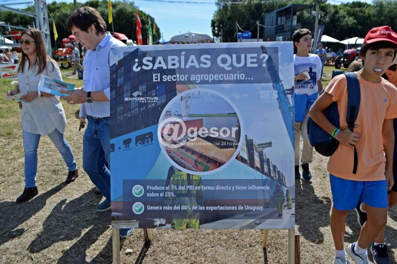 A pocos metros de traspasar el ingreso principal a Expoactiva Nacional, se podía apreciar en medio de una de las calles centrales seis paneles con doble lado en los que se habían colocado carteles en los que se brindaba información sobre la muestra y el sector agropecuario en general, relacionados con aportes que realiza el sector y los productores en particular a aspectos relacionados con la economía del país.