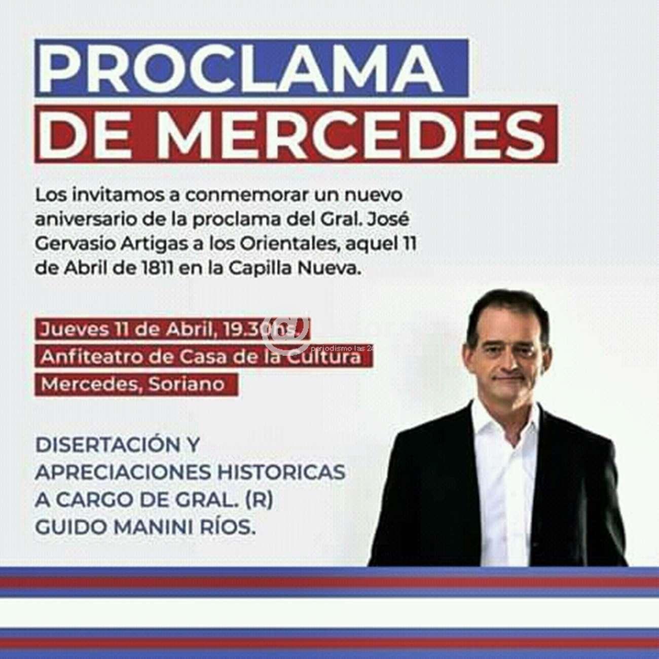 La actividad se desarrollará el jueves 11 de abril a las 19.30 horas en el anfiteatro de Casa de la Cultura de Mercedes (Soriano) y en la oportunidad se escuchará disertación y apreciaciones históricas a cargo del Gral. (r) Guido Manini Ríos sobre la conocida como Proclama de Mercedes.