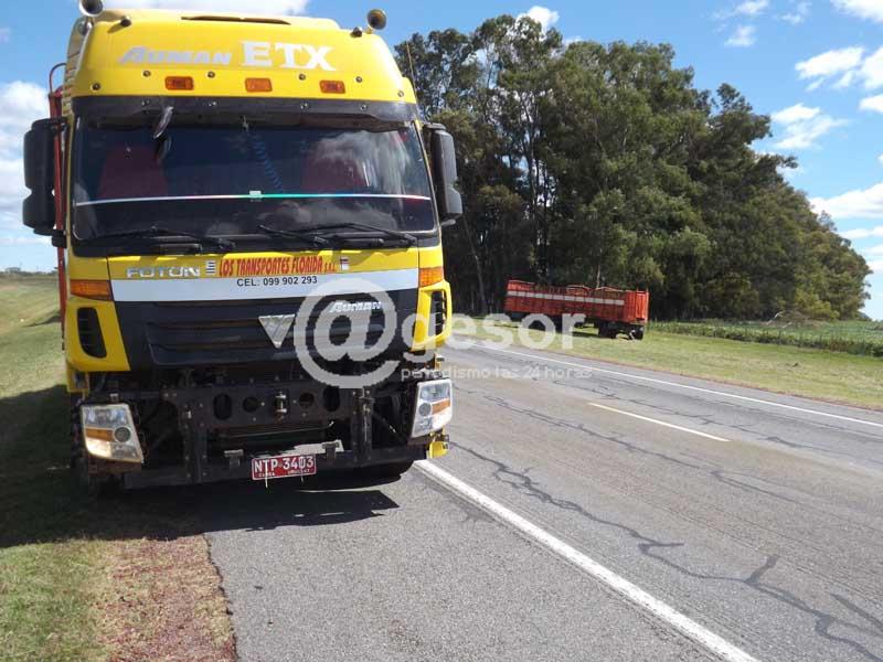En el kilómetro 249 de la ruta nacional N°2 un camión protagonizó un accidente de tránsito cuando se le desprendió la zorra en la que transportaba ganado vacuno. Se trata del camión Foton, matrícula NTP - 3403, que era conducido de norte a sur por Sebastián Calandria, que trabaja para la empresa -Los Transportes Florida S.R.L.. La desgracia fue con suerte, como lo dice el título, ya que a pesar de que el tránsito se encontraba congestionado por el pasaje de vehículos, en ese instante no transitaba nadie por el lugar, lo que podría haber sido trágico tanto para quienes se conducían en esa dirección o en dirección contraria, teniéndose en cuenta que muchos viajan rumbo a la Expo Activa Nacional. Como lo revela la fotografía de @gesor, la zorra del camión terminó saliéndose de la banquina y volcando contra uno de los campos de la zona.