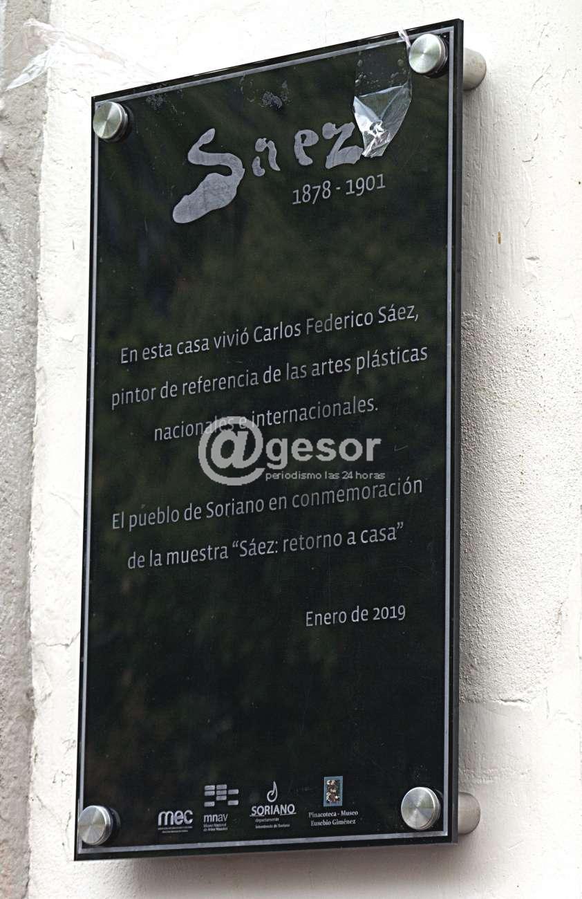 “En esta casa vivió Carlos Federico Sáez, pintor de referencia de las artes plásticas nacional e internacional. El pueblo de Soriano en conmemoración de la muestra Sáez retorno a Casa. Enero 2019”.