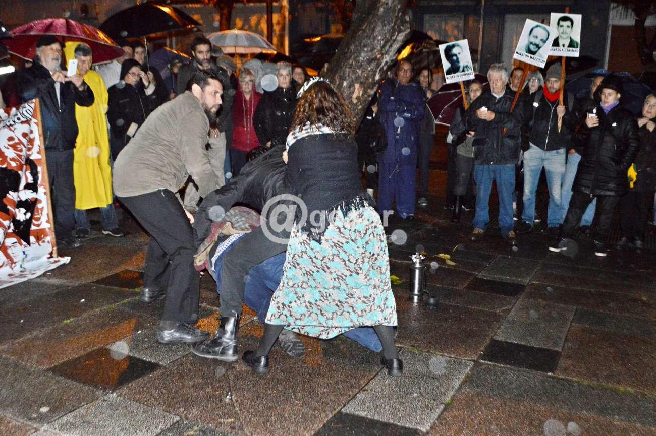El final de la movilización se dio con una representación artística realizada por jóvenes vinculados al SUNCA, quien llevaron adelante una escena de una detención de las que se dieron durante la época en que se practicó el terrorismo de Estado y allí paulatinamente cada uno de los presentes iba gritando ¡nunca más!, ¡nunca más!