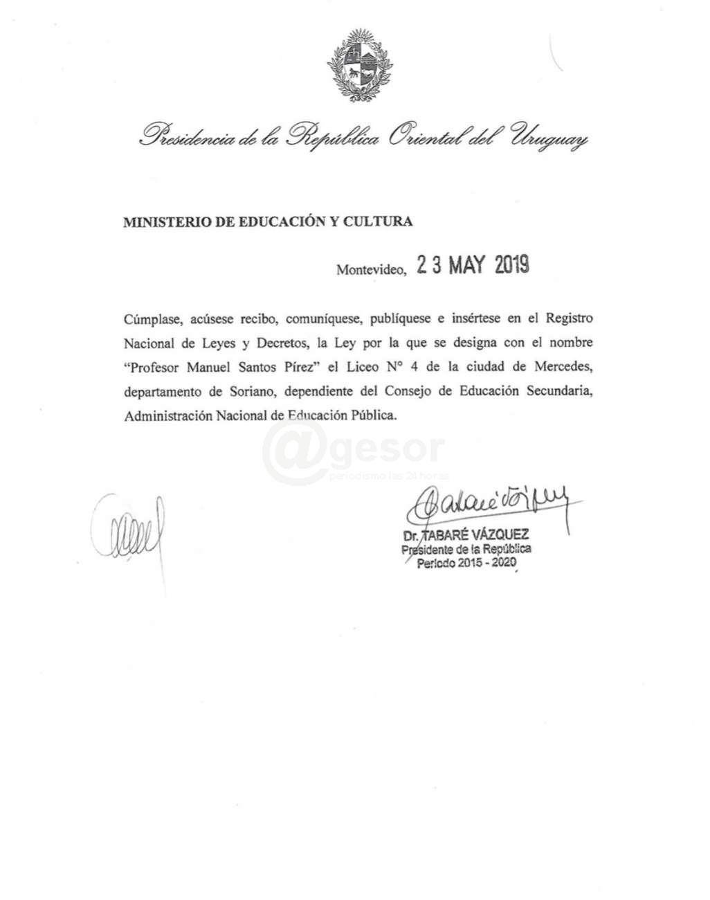 El Presidente Tabaré Vázquez promulgó el decreto respaldando la nominación del Liceo Nº 4 de Mercedes con el nombre “Profesor Manuel Santos Pírez”. Se completa así el trámite iniciado tiemo atrás reconociendo la figura y la trayectoria académica del prof. Santos Pírez.