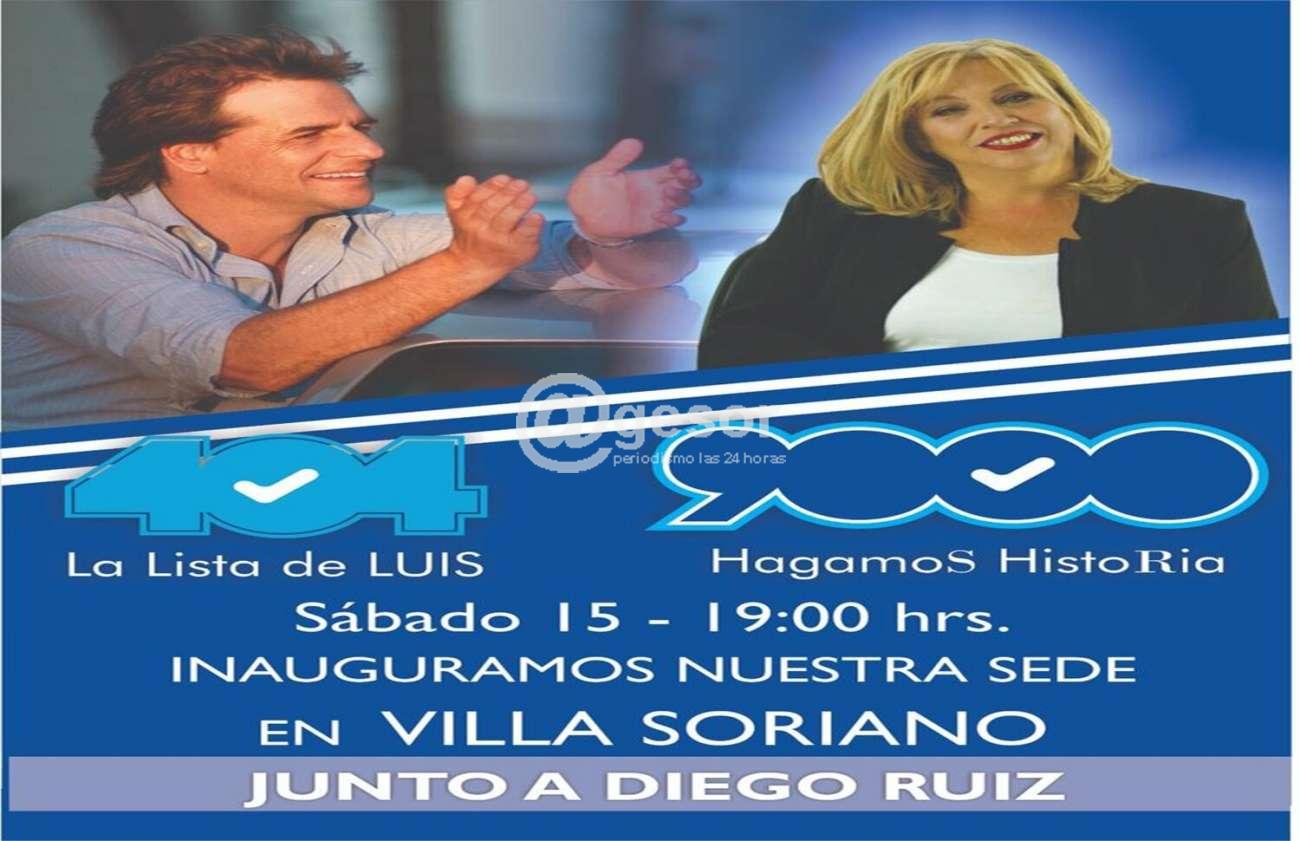Las listas 404 y 900 del Partido Nacional inauguran su local en Villa Soriano. Será este sábado 15 de junio a las 19 horas. en respaldo a la pre candidatura presidencial de Luis Lacalle Pou. Las listas que en lo departamental promueven la candidatura a la Intendencia de la Esc. Sandra Rusch, que en Villa Soriano tienen como referente a Diego Ruiz.
