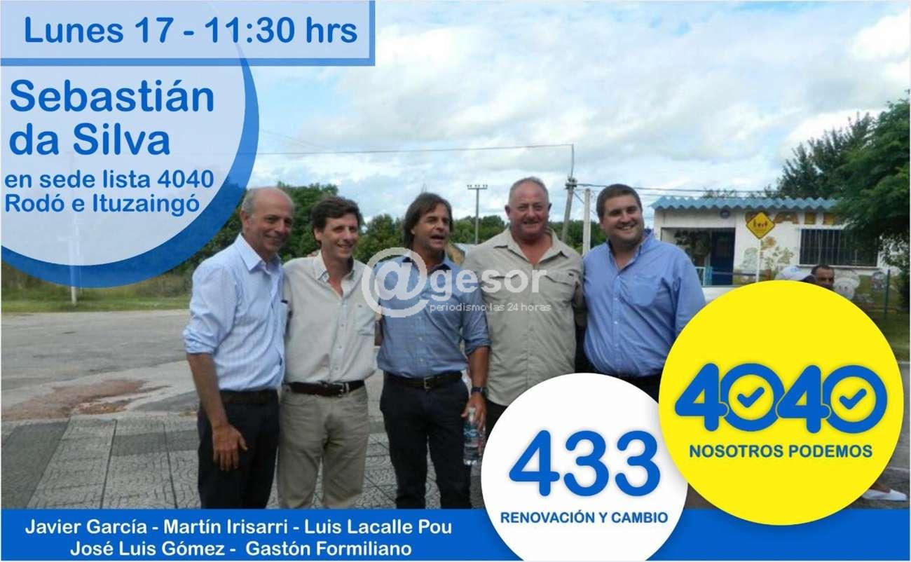 Este lunes en sede de la Lista 4040, en Rodó e Ituzaingó de Mercedes a las 11.30 horas estará recibiéndose a Sebastián da Silva, junto a los referentes departamentales de las Listas 4040 y 433 Martín Irisarri, José Luis Gómez y Gastón Formiliano. Acompañando la precandidatura de Luis Lacalle Pou a la Presidencia de la República, junto al Senador Javier García.