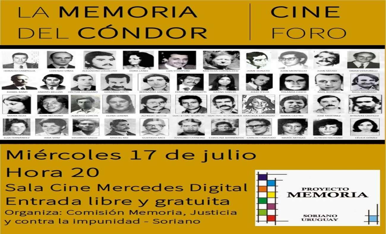 Este miércoles 17 de julio se realizerá otra actividad de Cine Foro, organizado por la Comisión Memoria y contra la impunidad de Soriano. Como ya es habitual, la actividad se realiza en la sala de Cine Mercedes digital, con entrada libre y gratuita. Este miércoles se proyectará la película La memoria del Cóndor un documental que repasa la coordinación del terrorismo de Estado en América Latina, apoyado por Estados Unidos, y el juicio histórico de Roma contra los responsables de aquellos hechos. Documental realizado por Emanuela Tomasetti .