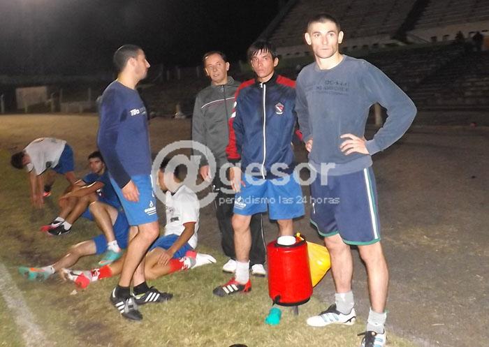 FOTO. Enzo Morales, John Salvador y Bernardo Golly, entre otros componentes del seleccionado mercedario, durante una pausa del entrenamiento de este jueves en el EstadioKoster.