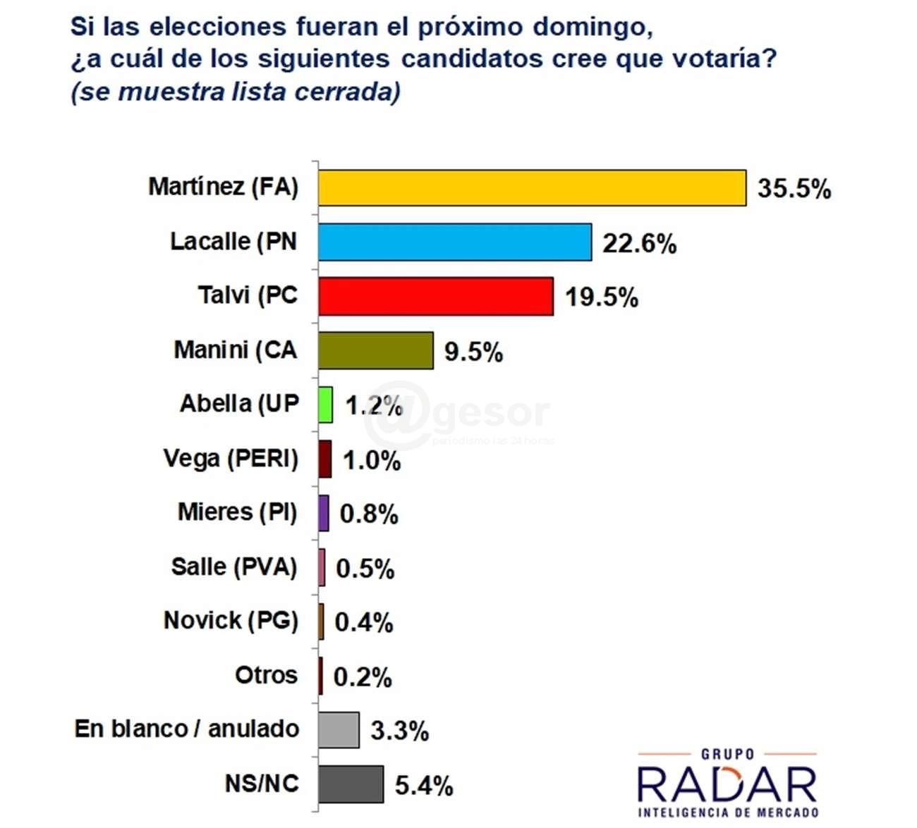 El Grupo Radar difundió la primera encuesta, realizada una vez que culminaron las elecciones internas, y se conoció quiénes serán los candidatos que presentarán en octubre próximo los partidos políticos. El resultado de esta encuesta, realizada entre el 4 y el 10 de julio pasado marca que el frenteamplista , Daniel Martínez encabeza las preferencias (35,5%), seguido del nacionalissta Luis Lacalle Pou (22,6%) y del colorado Ernesto Talvi (19,5%).