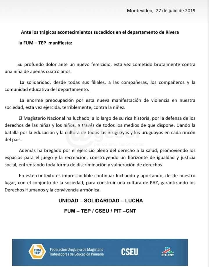 Ante los trágicos acontecimientos sucedidos en el departamento de Rivera la FUM-TEP, en un comunicado manifiesta: