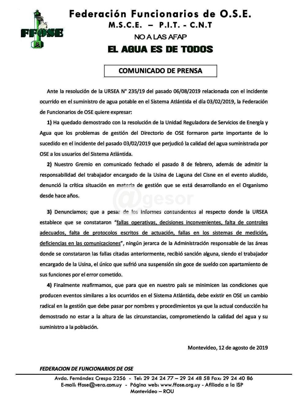La Federación de Funcionarios de OSE (FFOSE) hizo llegar comunicado a @gesor en el que expresan que "ante la resolución de la URSEA Nº 235/19 del pasado 6/8/2019 relacionada con el incidente ocurrido en el suministro de agua potable en el Sistema Atlántida el día 3/2/2019, la Federación de Funcionarios de OSE quiere expresar: