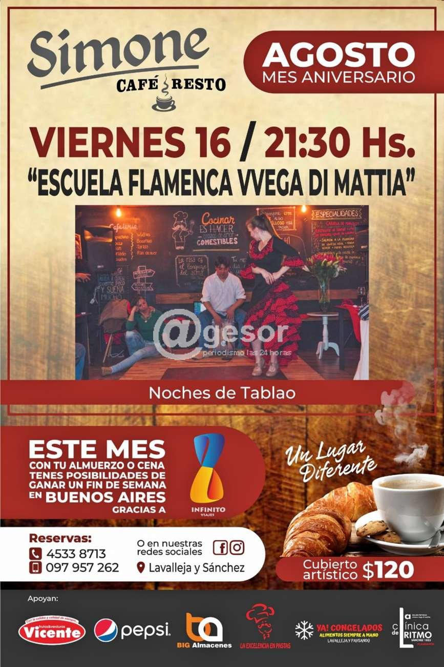 Este viernes en SIMONE Café & Resto, Noches de Tablao con ¨Escuela flamenca VVega Di Mattía¨. Podrás disfrutar de ello desde las 21.30 horas en el local de avda. Lavalleja y Sánchez festejando el mes aniversario con la carta especial que te ofrece un lugar diferente. >Cubierto artístico $ 120. Reserva anticipada de mesas a través del tel. 4533 8713 o cel. 097 957 262.