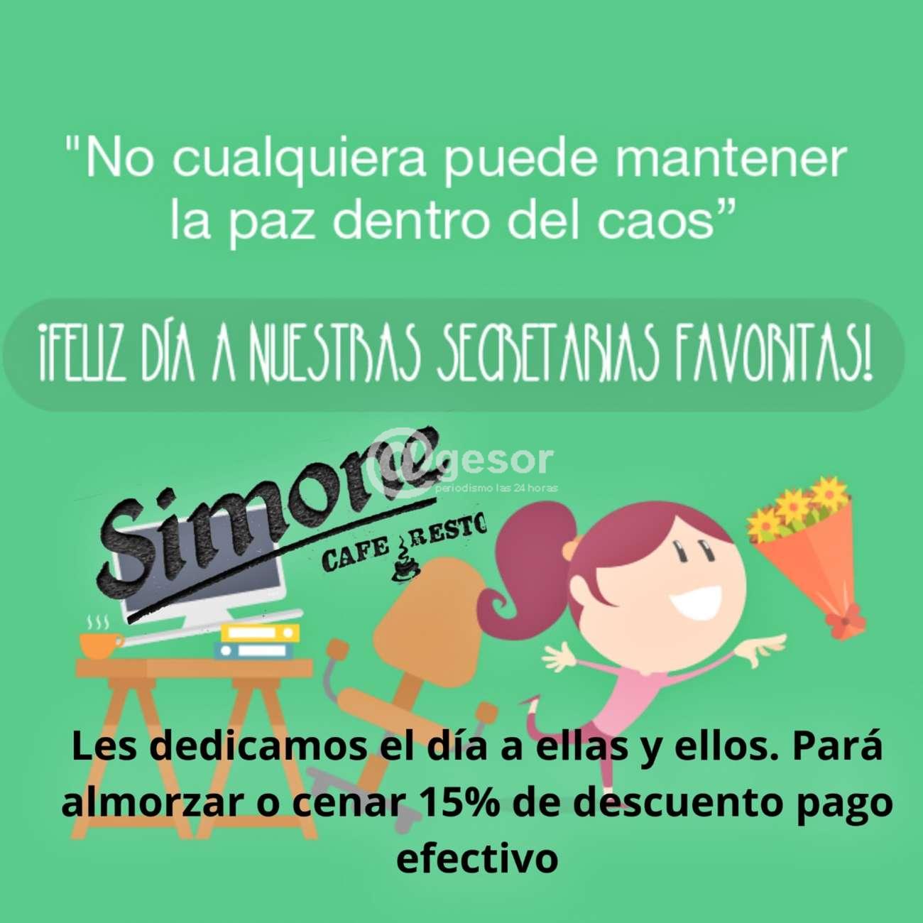 El 4 de setiembre de cada año en Uruguay se celebra el Día de la Secretaria y del Secretario y SIMONE Café & Resto no podía estar ajeno a esta celebración por lo que está ofreciendo para este miércoles una promoción especial, deseándoles ¡Feliz Día! Les dedicamos el día a ellas y ellos, para almorzar o cenar 15% de descuento pago efectivo en el local de avda. Lavalleja y Sánchez, porque "no cualquiera puede mantener la paz dentro del caos", ¡felicidades! Reservas especiales a través de nuestros teléfonos 4533 8713 o 097 957 262 o por nuestras redes sociales Facebook e Instagram.