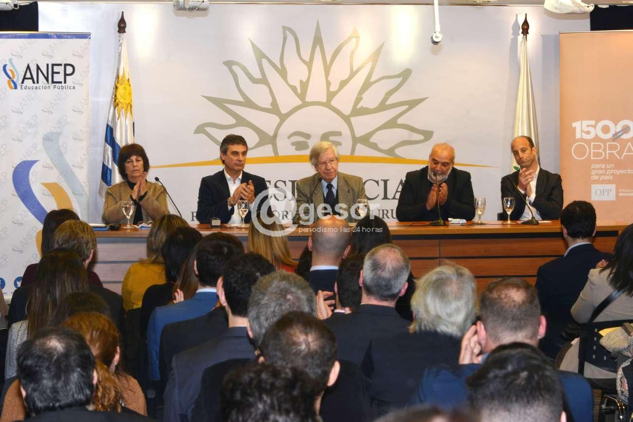 Representantes de la Oficina de Planeamiento y Presupuesto (OPP), del Ministerio de Economía y Finanzas (MEF), de la Administración Nacional de Educación Pública (ANEP) y del Instituto del Niño y del Adolescente del Uruguay (INAU), firmaron el primer contrato de participación pública privada (PPP) de infraestructura educativa.