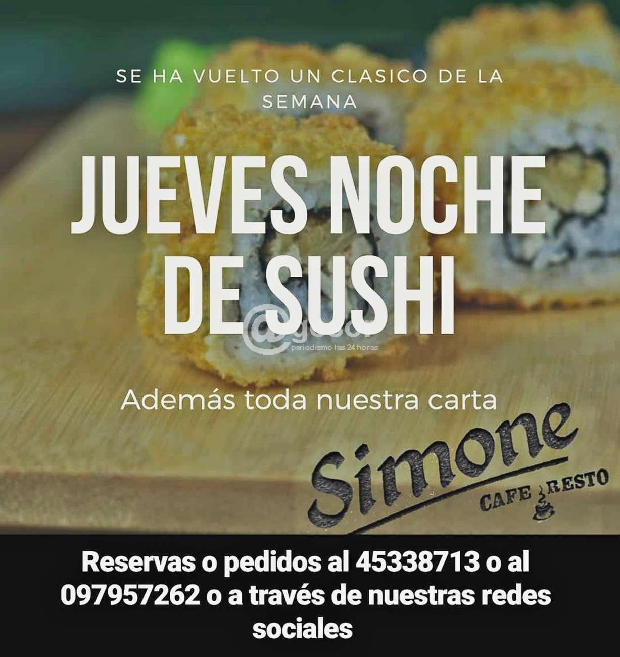 Este jueves seguimos con un clásico de la semana, noche de sushi en SIMONE Café & Resto, en el local de avda. Lavalleja y Sánchez de Mercedes. Además podrá disfrutarse de toda nuestra carta. Por reservas o pedidos pueden comunicarse al 4533 8713 o al cel. 097 957 262 o a través de nuestras redes sociales en Instagram o Facebook.