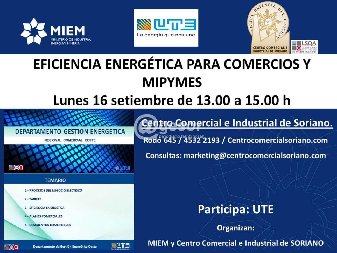 En salón del Centro Comercial e Industrial de Soriano, con la organización del Ministerio de Industria, Energía y Minería y el Centro Comercial e Industrial de Soriano, dictada por personal de UTE, estará realizándose charla informativa sobre "Eficiencia energética para comercios y mipymes", el lunes 16 de setiembre de 13.00 a 15.00 horas. Los exponentes pertenecen al Departamentpo de Gestiòn Energética de la Regional Comercial Oeste de UTE y el temario incluye: procesos del negocio eléctrico, tarifas, eficiencia energética, planes comerciales, descuentos comerciales.
