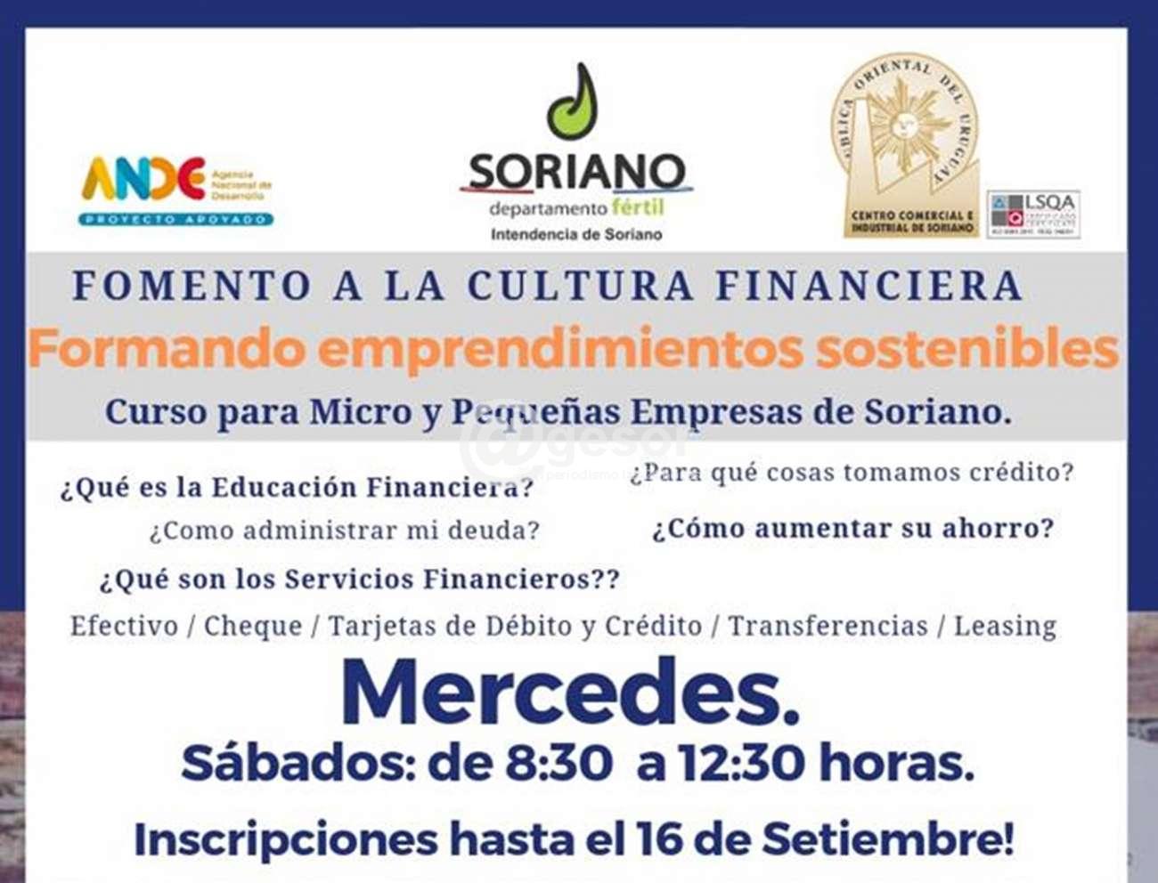 Con la organización de Semilla ANDE, Intendencia de Soriano a través de la Oficina de Desarrollo, y el centro Comercial e Industrial de Soriano, está convocándose a participar de curso denominado "Formando enprendimientos sostenibles" de fomento a la cultura financiera, destinado a micro y pequeñas empresas de Soriano.