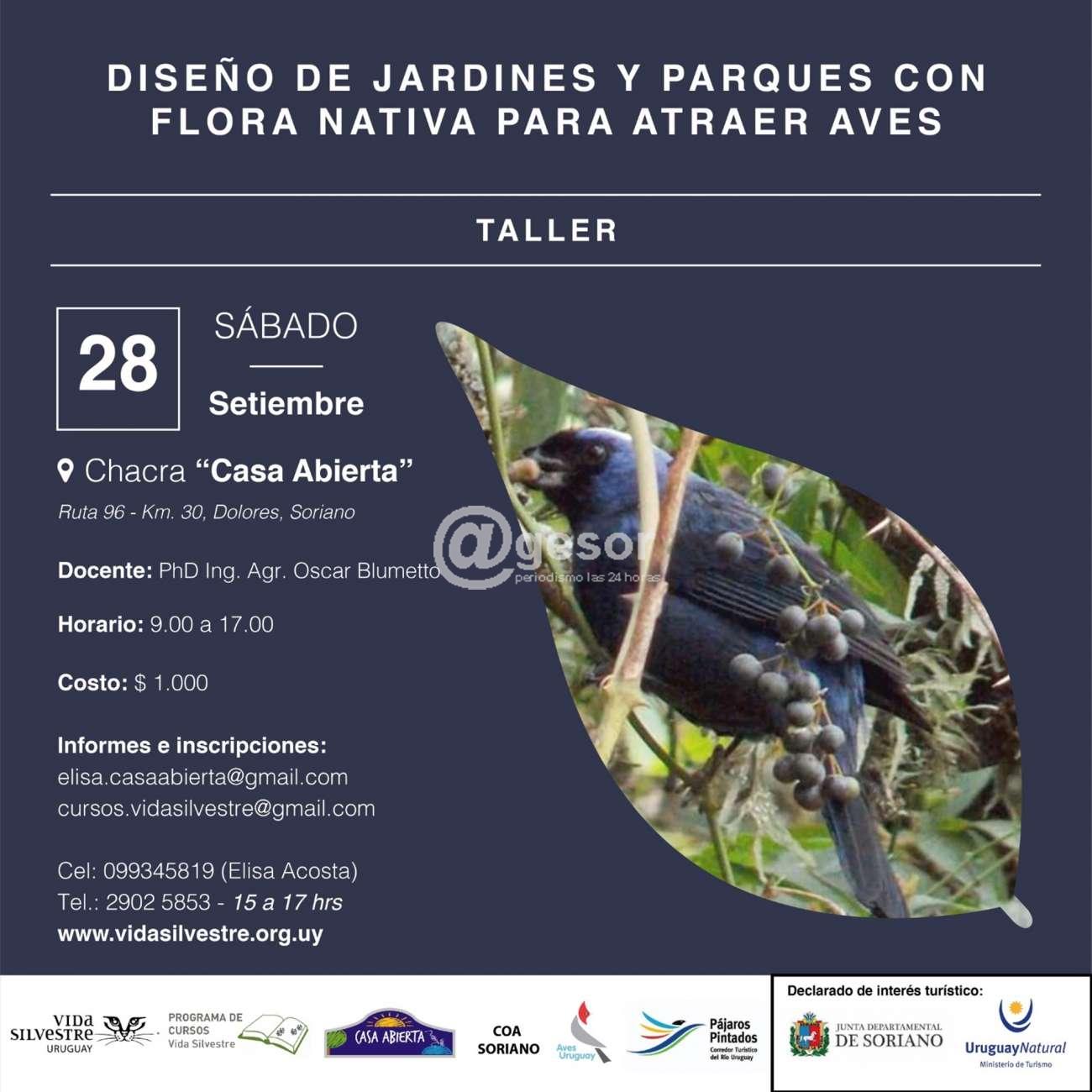 El sábado 28 estará desarrollándose taller sobre "Diseño de jardines y parques con flora nativa para atraer aves", será en la chacra "Casa Abierta" ubicada en ruta 96 km 30 en cercanías de Dolores, estando a cargo del docen phd ing. Oscar Blumetto, en el horario de 9.00 a 17.00 con un costo de $ 1.000.
