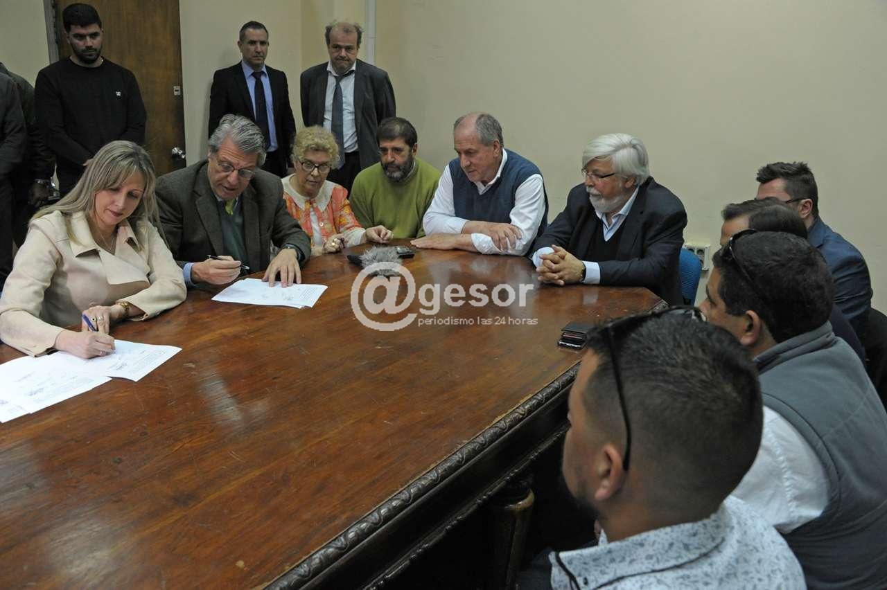 Autoridades del Ministerio de Trabajo y Seguridad Social y del Ministerio del Interior, de la central sindical única PIT-CNT, del Sindicato de Funcionarios Policiales de Montevideo (Sifpom) y del Sindicato Único de Policías del Uruguay (SUPU) se reunieron en la sede de la Dirección Nacional de Trabajo para suscribir el convenio de incremento de 50 horas mensuales a 100 de trabajo de los efectivos de la fuerza de seguridad por concepto de servicios 222.