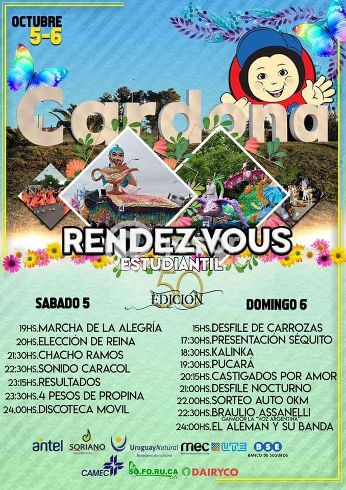 El 5 y 6 de octubre se realiza en Cardona la edición número 50 del Rendez Vous estudiantil. La fiesta de la Primavera de Cardona que cada edición concita el interés de público de la región. Este año con el atractivo de la participación de varios artistas de nivel que estarán estrenando el escenario que el Municipio local viene construyendo en el Parque Cazeaux. Una obra que quedará para desarrollar actividades al aire libre durante todo el año.