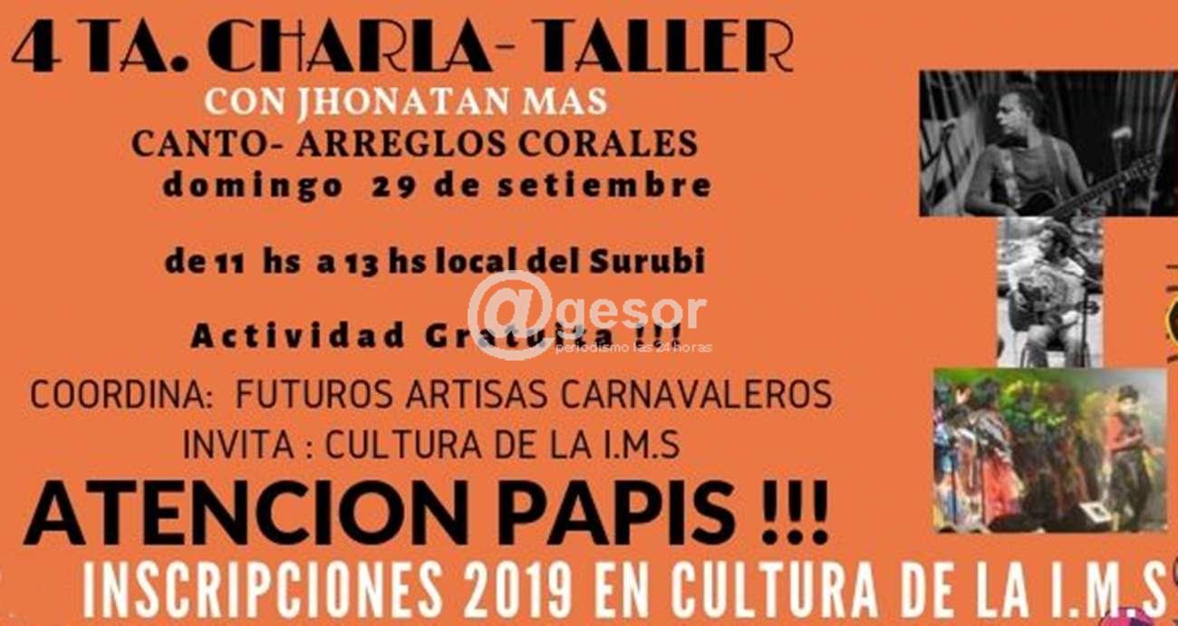 Este domingo 29 de 11.00 a 13.00 horas en local de El Surubo (19 de Abril y avda. Asencio) de Mercedes se desarrollará la cuarta charla taller en el marco del proyecto que coordina Futuros Artistas Carnavaleros e invita la Dirección de Cultura de la Intendencia de Soriano, actividad que se lleva a cabo en forma gratuita. Esta vez los temas centrales son Canto y Arreglos Corales siendo el docente a cargo Jhonatan Más. Se trata de una actividad dirigida a niños, adolescentes y jóvenes de 8 a 18 años.