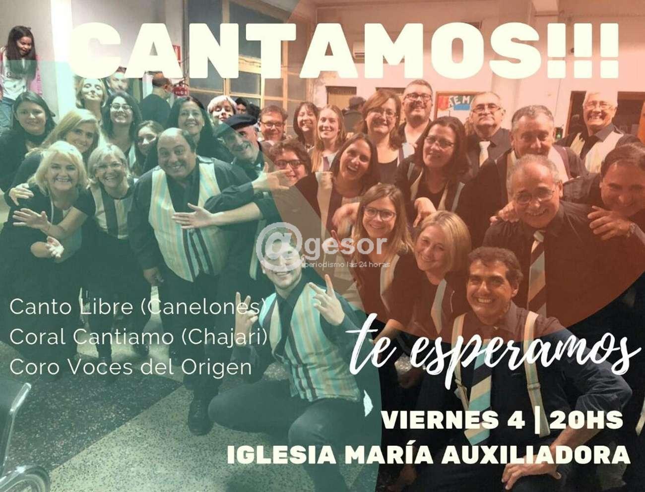 Este viernes en la Iglesia María Auxiliadora se realiza un Encuentro de agrupaciones corales. Este evento comenzará a las 20 horas, actuando Canto Libre” de Canelones, Coral “Cantiamo” de Chajarí (Entre Ríos – RA) y el coro “Voces del Origen”. Se trata de una de las actividades que se realizan este fin de semana en el marco de la “Trotamusica 2019”.