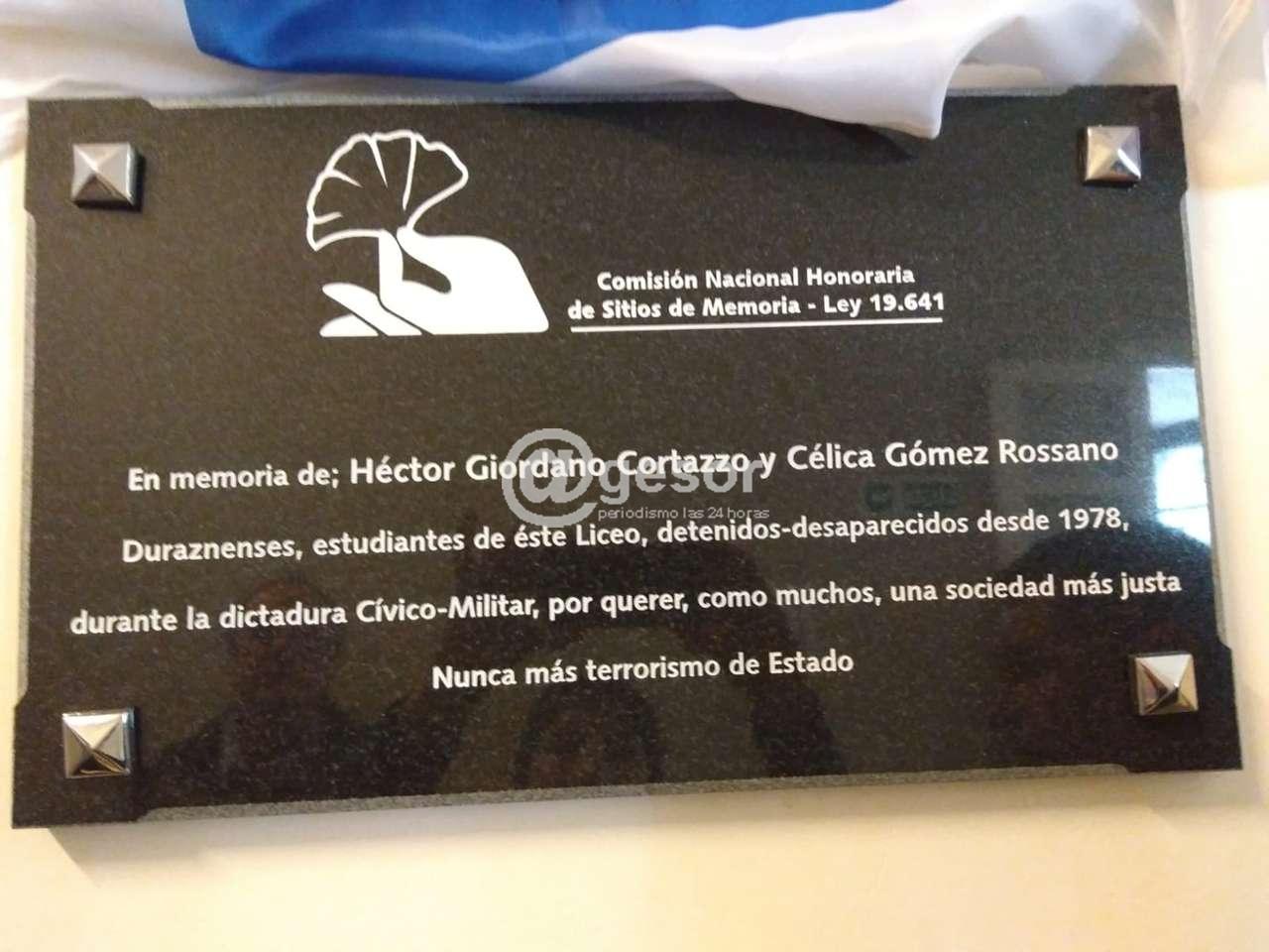 La Comisión Nacional Honoraria de Sitios de Memoria colocó una placa en el Liceo Nº 1 de Durazno en recuerdo de Célica Gómez y Héctor Giordano. Dos uruguayos detenidos desaparecidos en el año 1978 en el marco del Plan Cóndor.
