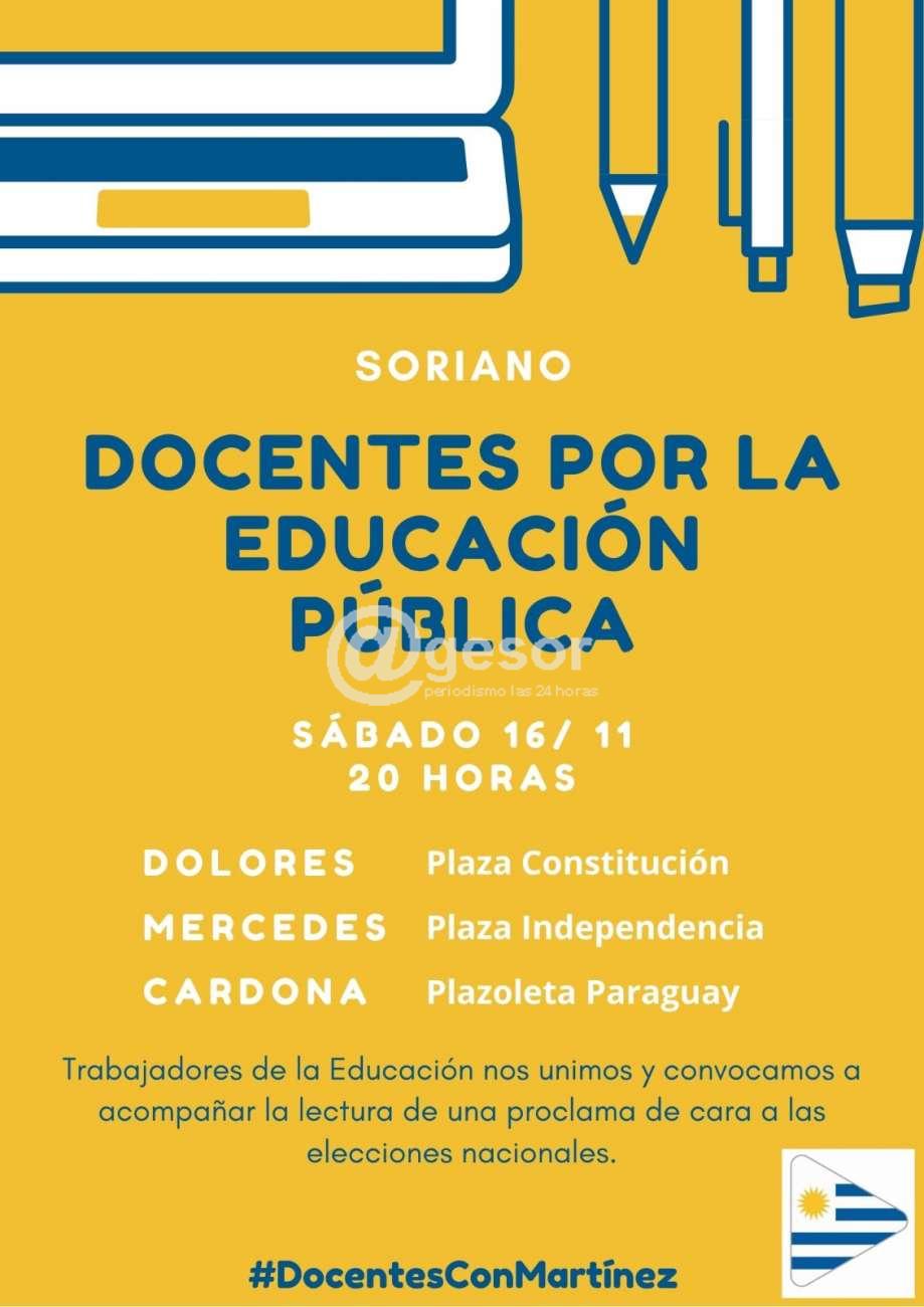 Se anuncia una actividad donde Maestros, Profesores de UTU y Liceo de Soriano se concentrarán en forma simultánea para leer una proclama, en Mercedes, Dolores y Cardona, en la que se pretende fundamentar, nuestro apoyo a Daniel Martínez, su equipo y su proyecto.