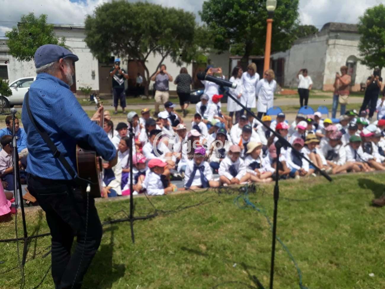 Acompañado por los niños y por el profesor de música de la Escuela, Jorge Luis Cueik, el cantautor Mario Carrero -floridense, hijo de una cruceña y además parienta de Julio Castro-, entonó A don José, del maestro Ruben Lena.