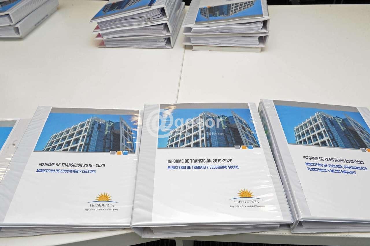 El director de la Oficina de Planeamiento y Presupuesto, Álvaro García, el secretario de Presidencia, Miguel Ángel Toma, y el prosecretario, Juan Andrés Roballo, entregaron en el piso 5 de la Torre Ejecutiva al secretario de la Presidencia designado, Álvaro Delgado, y al prosecretario designado, Rodrigo Ferrés, los materiales que detallan la información de cada secretaría de Estado y del Gobierno en general.