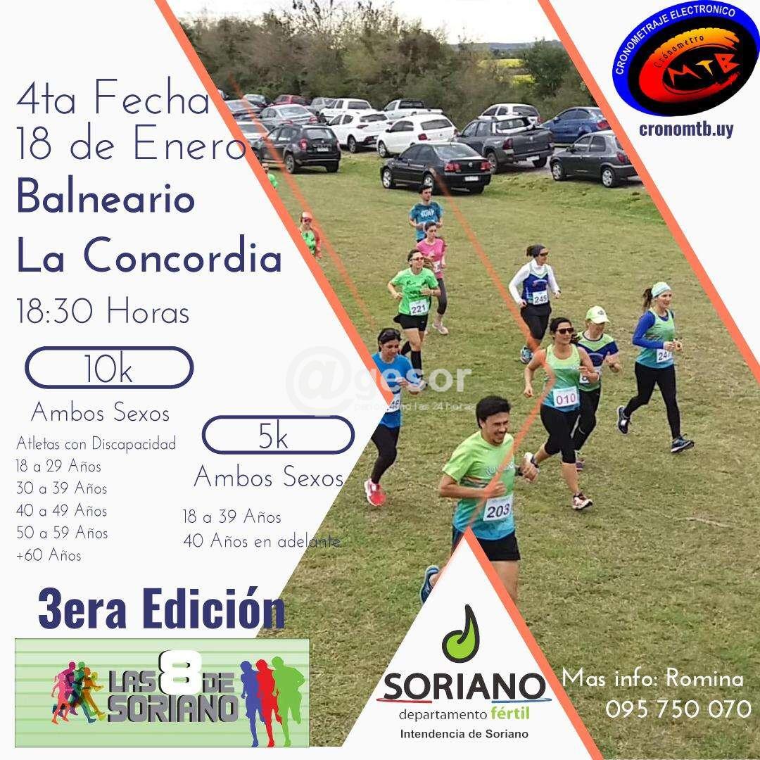 Este sábado se en el Balneario La Concordia se disputa la 4ta fecha de las 8 de Soriano. La competencia, como es habitual, se disputa en 10 y 5 kilómetros, para ambos sexos. Comenzará a las 18,30 horas corriéndose en categorías que van desde 18 a m{as de 60 años.