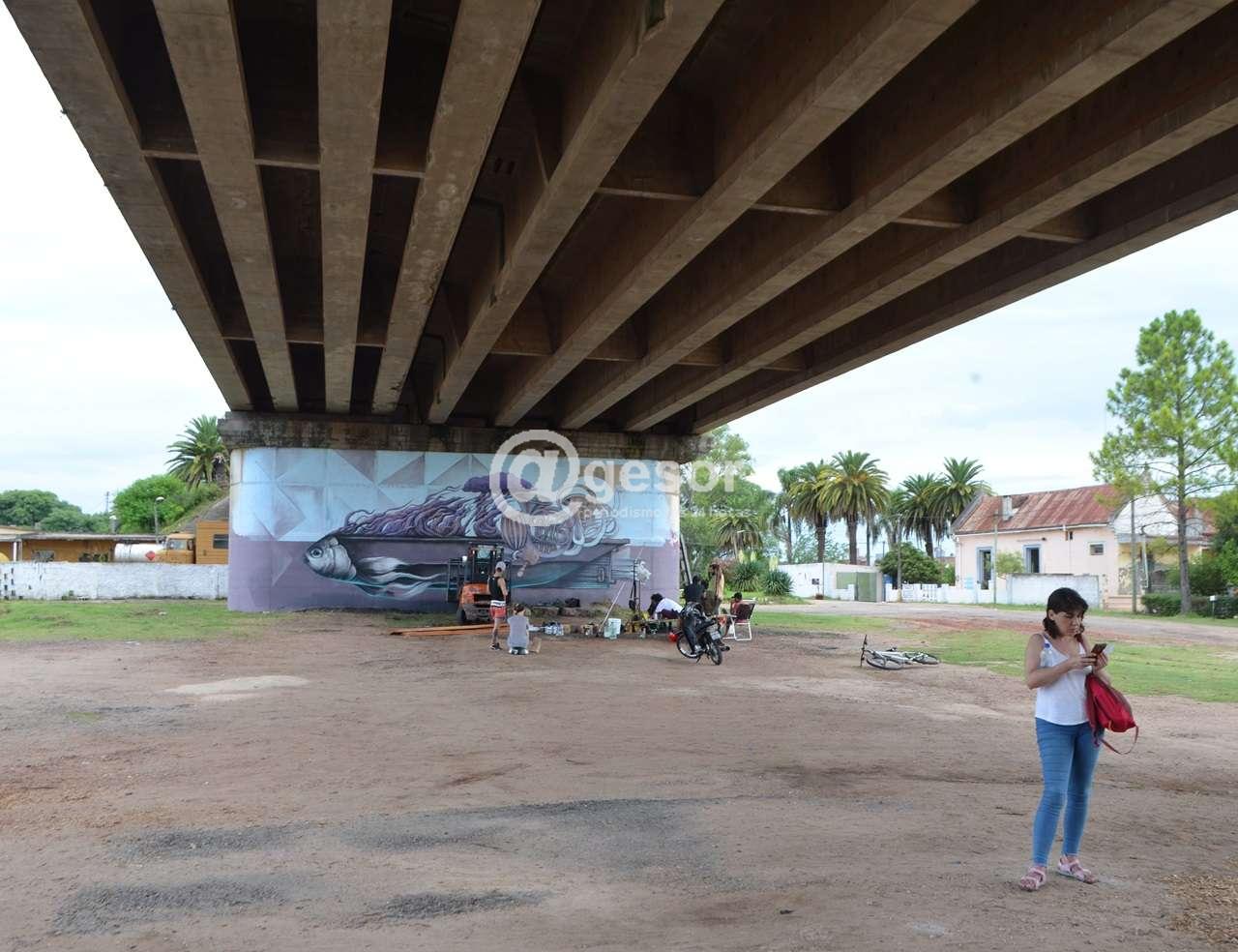 Frente ellas trabajan en otro de los pilares del puente, Roque junto a Kaimo, y Fran , tres jóvenes llegados desde las Islas Canarias. Roque en diálogo con @gesor Roque comentó que llegaron a Mercedes simplemente por la invitación recibida. Cuando le preguntamos por qué viajar tantos kilómetros a un país y una ciudad desconocida, nos interrumpió: “lo dices y se me pone una sonrisa” ya que “nos encanta estar con la gente, compartiendo. Si estás pintando en tu estudio al final terminan conociendo a tu cuadro, a ti y a pocos más; y aquí en la calles es un continuo conocimiento. Si no es pintura, es escultura, música. No sólo pintura, sino un montón de cosas; y da igual que sea aquí que en Pekin, se crea una energía muy potente”. Resumiendo en gran parte lo trasmitido por casi todos los artistas que dialogamos en esta recorrida. También todos destacaron la buena disposición y trato cordial brindado por los mercedarios. Como lo relató “Cast”, “recibo muchos favores de la gente, están muy dispuestos a darme cosas sin que se los pida. Tengo agua todo el tiempo. La panadería de enfrente está súper presente ofreciéndome cosas. La gente se queda a conversar”, definiendo esa actitud “como un abrazo”.