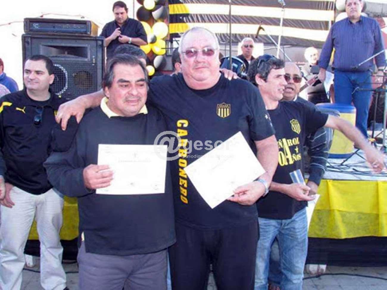 En la fotografía de celebración de aniversario de Peñarol, Pocho Berger (derecha) junto a Jorge Aguilar (izq).