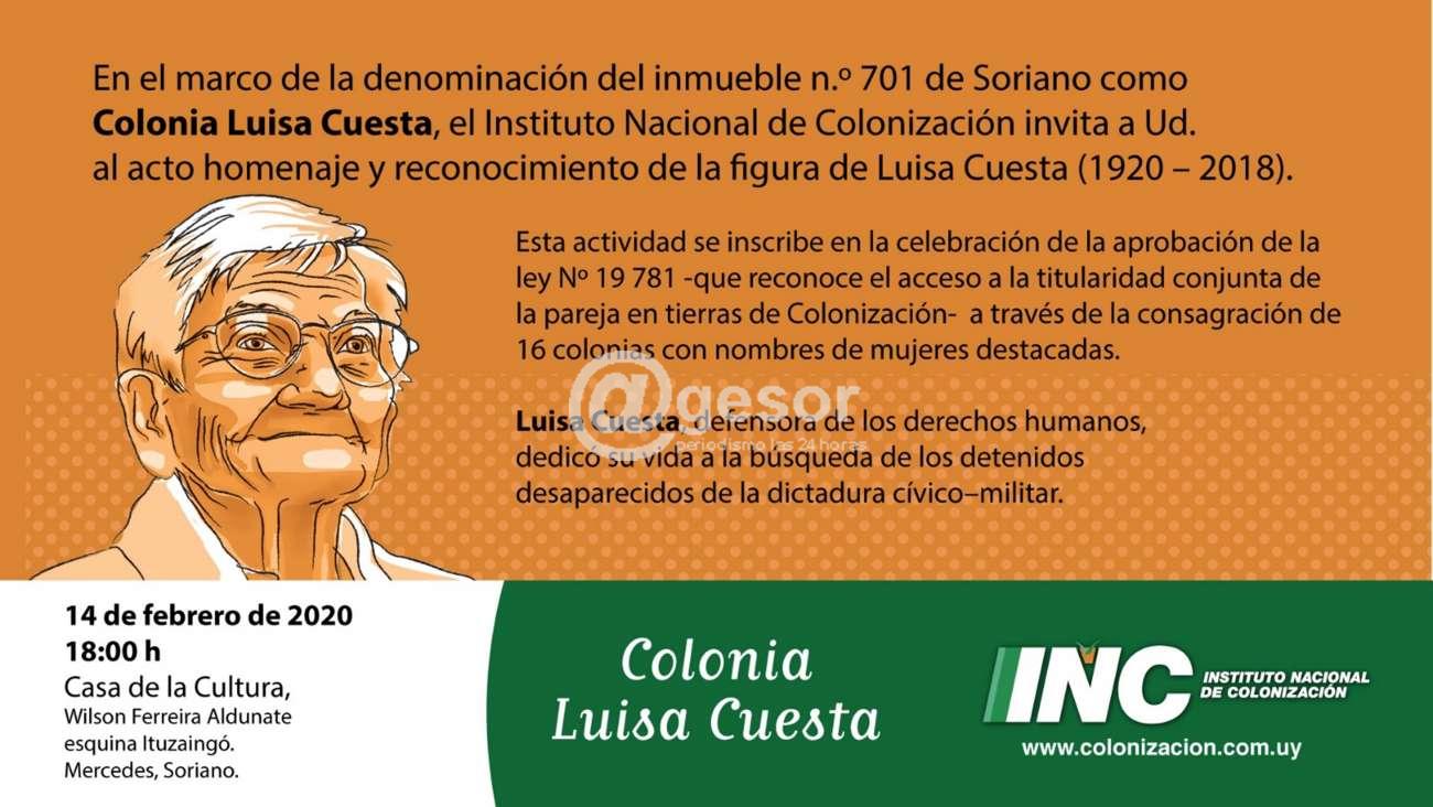 En el marco de la denominación del inmueble Nº 701 de Soriano como Colonia Luisa Cuesta, el Instituto Nacional de Colonización está invtando al acto homenaje y reconocimiento de la figura de Luisa Cuesta (1920 - 2018).