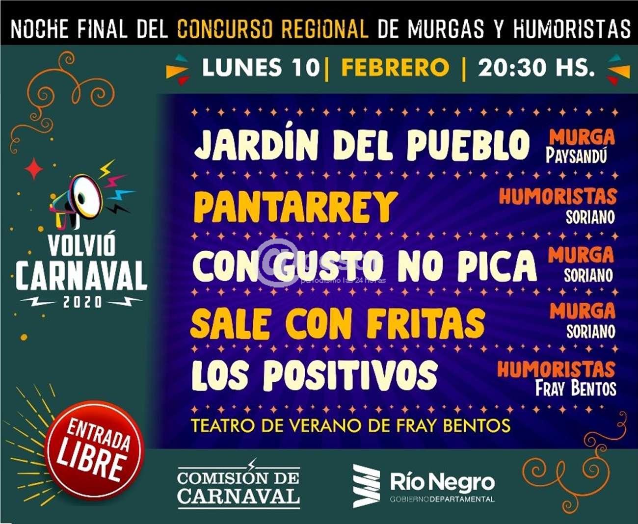Tres conjuntos de Mercedes disputarán esta noche la final del Concurso de agrupaciones del Carnaval de Río Negro. Los Humoristas Pantarrey y las Murgas Con gusto no pica y Sale con fritas van por el primer puesto en sus respectivas categorías.
