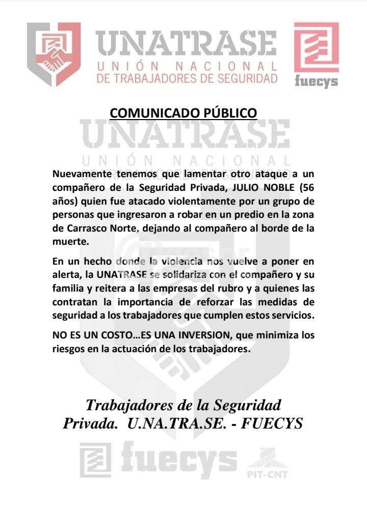 "Nuevamente tenemos que lamentar otro ataque a un compañero de la seguridad privada" comienza diciendo un escueto comunicado emitido en las últimas horas por los trabajadores de la seguridad privada, ante un nuevo ataque a un trabajador ocurrido en la capital del país, que fue atacado tras copamiento en Carrasco Norte lo ataron y golpearon.