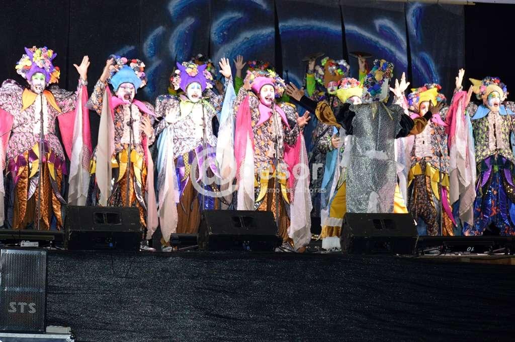 La murga ocupa muy bien el escenario y en los desplazamientos de sus componentes no le quitan, ni ritmo, ni firmeza al coro en una buena puesta en escena de su responsable Richard Calistro.