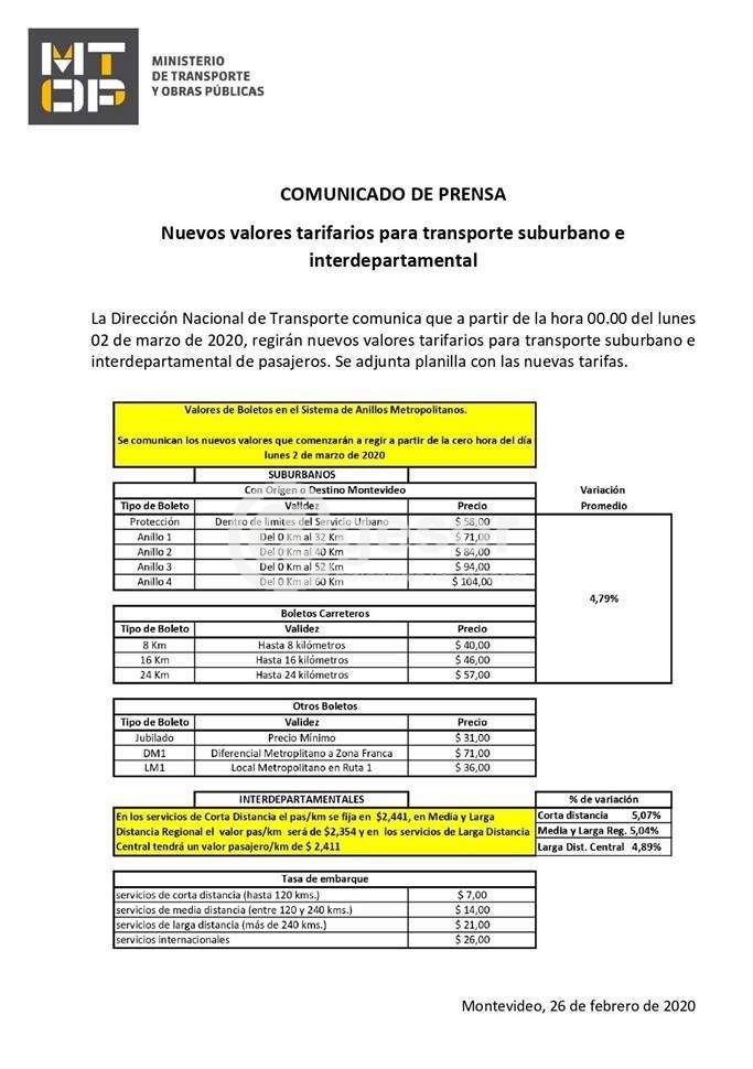 La Dirección Nacional de Transporte comunicó que a partir de la hora 00.00 del lunes 02 de marzo de 2020, regirán nuevos valores., regirán nuevos valores tarifarios tanto para el transporte suburbano como el interdepartamental.